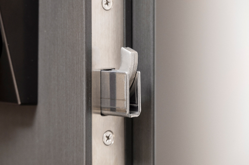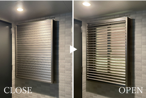 共用廊下側の窓には、採光や通風を確保しつつ、プライベート性や防犯性を高める可動式ルーバー面格子を採用。