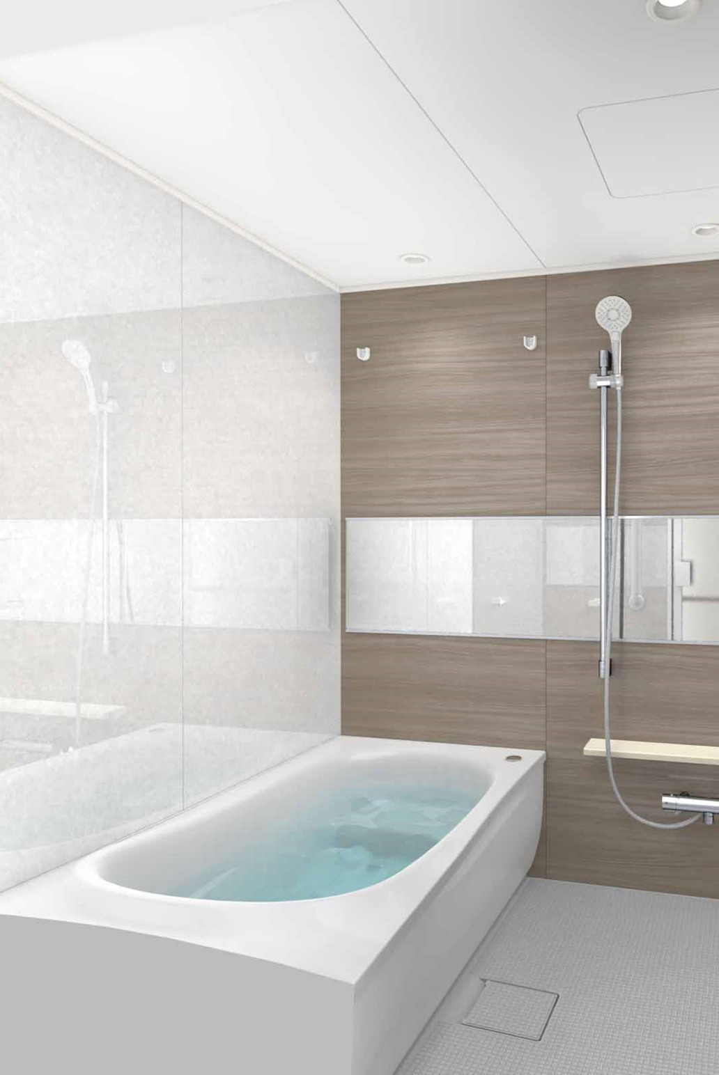 心からリラックスできるバスルームを創出するため、浴室の印象を決める壁面の一部にアクセントパネルを採用することで心地良い癒やし空間を実現。HQパネルのため、汚れやカビも付着しにくく、お手入れも簡単です。