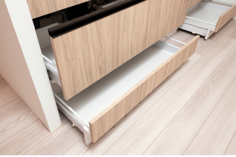 通常ならデッドスペースとなる巾木部分にも、食品ストックな どに利用できる収納スペースをご用意。