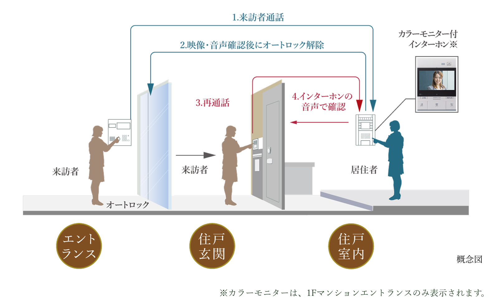 マンション来訪者はエントランスのオートロックにおいて画像にて確認。さらに各住戸前のインターホン通話にて音声でもう一度確認いただけるため、二重の確認隣不審者を近づけないので安心です。※カラーモニターは、1Fマンションエントランスのみ表示されます。