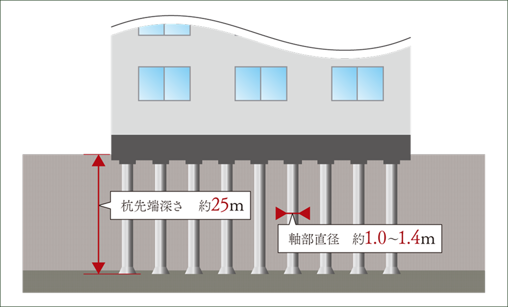基礎梁下部には全体で67本の杭を配置し、地表より約−23.58m付近から出現する安定した支持層まで築造する「現場打ち鋼管コンクリート杭(付属施設を除く)」を採用。地盤調査に基づいて、堅固な支持地盤に杭を届かせ、万一の地震の揺れから建物を守ります。