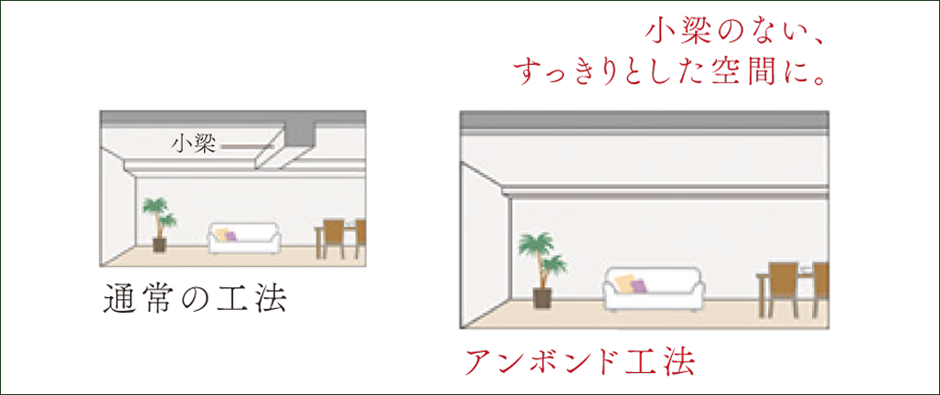 コンクリートスラブと床、コンクリートスラブと天井の間に空間を確保し、遮音性能を高め生活音の伝わりを軽減。将来のリフォームやメンテナンス性も高い構造です。
