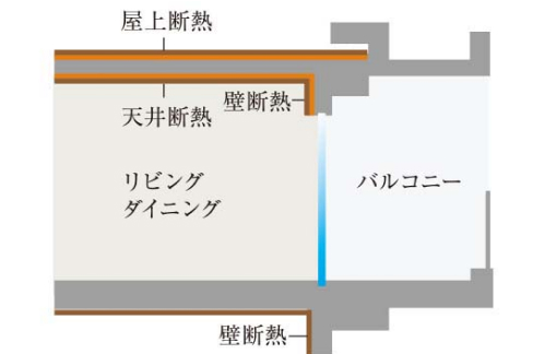 より快適な住空間を実現するために、屋上は外断熱、住戸内は外気に接するコンクリート躯体の室内側と天井内の床コンクリート下全面に断熱材を施しています(一部住戸除く)。屋上・壁・天井の断熱性を高めることで、外の熱気や冷気から快適な室内環境を守り、結露抑止効果を高めています。