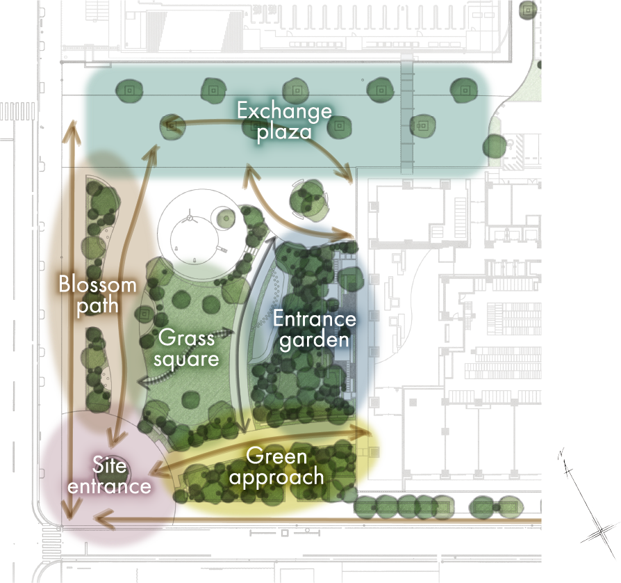 円形のベンチとシンボルツリーを組み合わせた象徴的な空間が、敷地全体の顔になります。