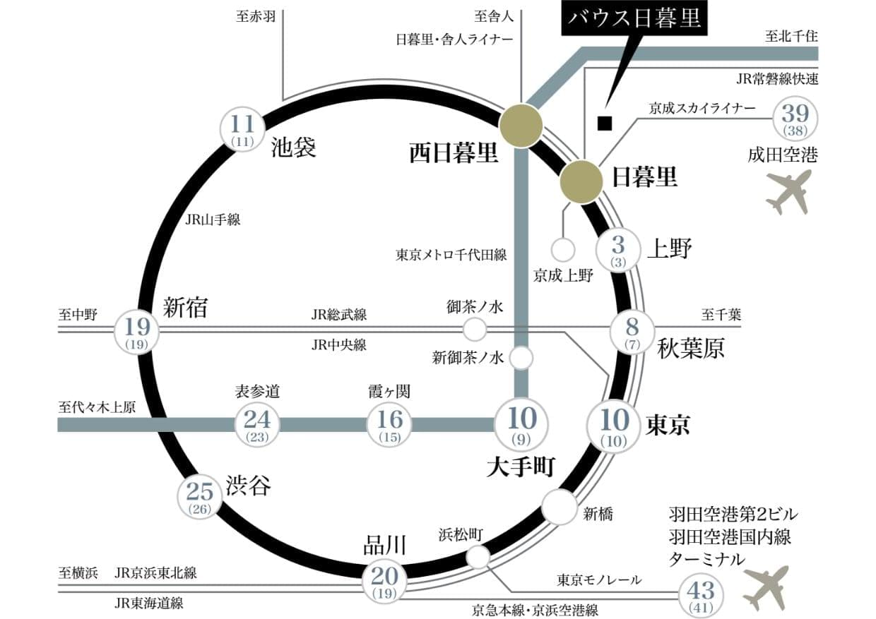 - ■日暮里駅より、「上野」駅へ:JR常磐線利用(日中時3分)、「秋葉原」駅へ:JR山手線利用(日中時7分)、「東京」駅へ:JR常磐線利用(日中時10分)、「品川」駅へ:JR常磐線利用(日中時19分)、「羽田空港第2ターミナル」へ:京浜東北線利用「浜松町」駅で東京モノレール空港線快速に乗換え(日中時41分/JR山手線利用「浜松町」駅で東京モノレール空港線快速に乗換え)、「成田空港」へ:京成スカイライナー利用(日中時38分)※別途特急料金がかかります。