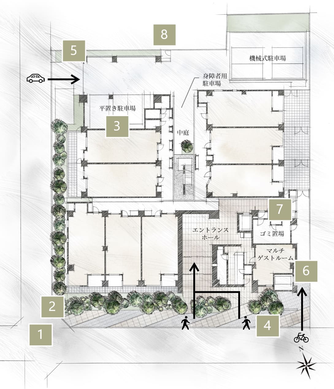 - ※掲載の敷地配置イラストは計画段階の図面と地図を基に描き起こしたもので、形状・色等は実際とは異なります。また、建物周囲の電柱、標識、ガードレール等は省略または簡略化して表現しています。