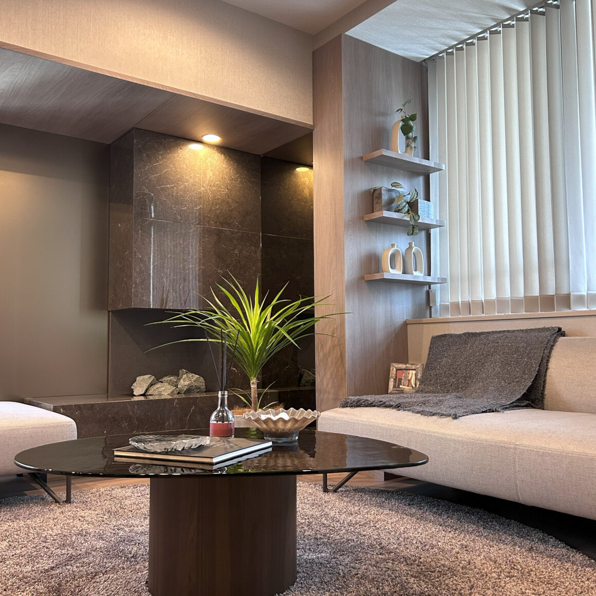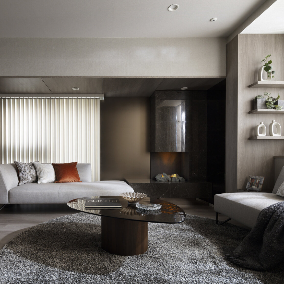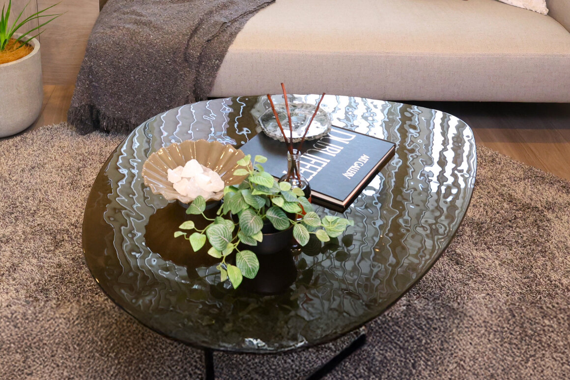そのL字に組まれたソファの中心には、視線を惹きつけるローテーブルが佇んでいます。円形でも四角でもない有機的なフォルムは、どの角度から見ても美しく、空間にやわらかな動きを与えています。