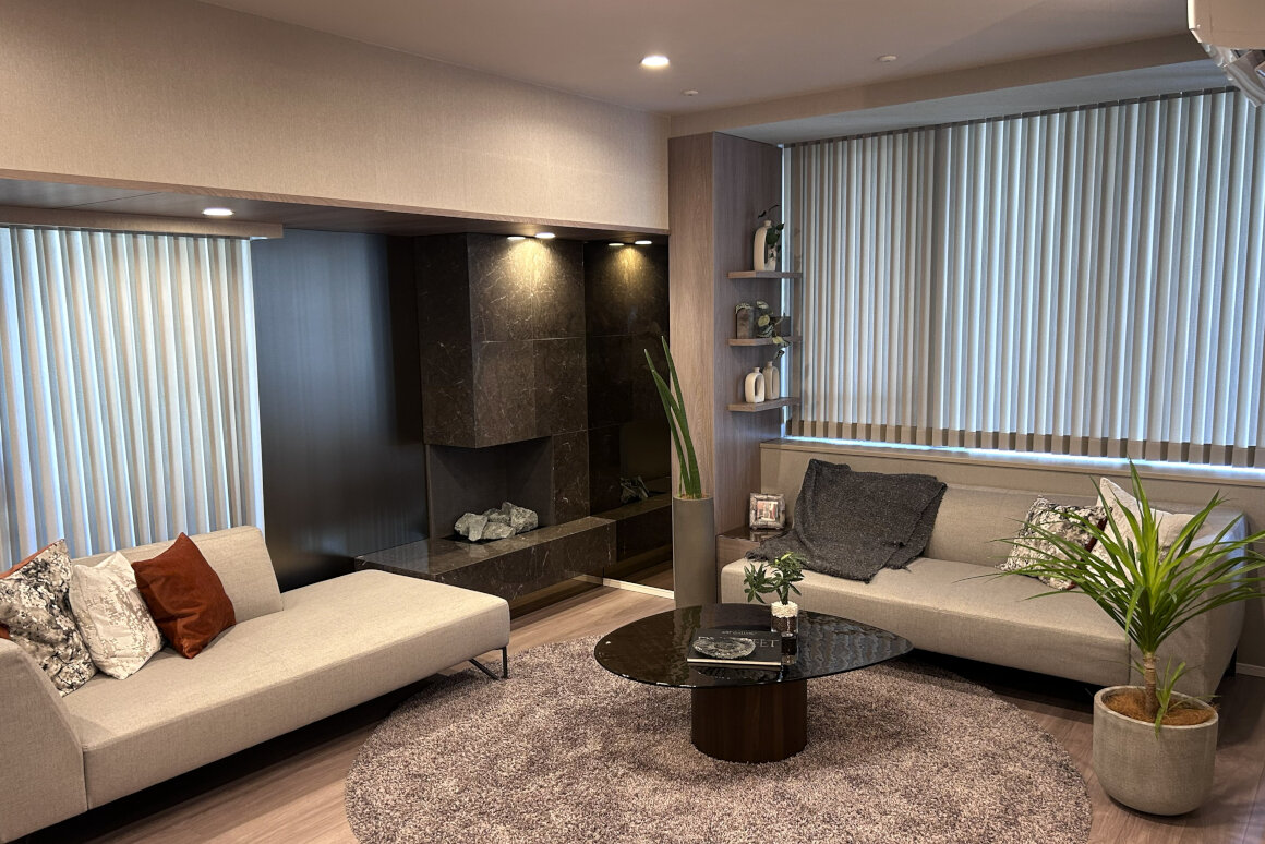 こうした配置の工夫は、モデルルームの空間づくりにも活かされています。リビングでは、ご夫婦が語らいの時間を楽しめるよう、2台のソファをL字に組み合わせ、ゆったりとしたコーナーを設けています。リビング全体が見渡せる位置に配置することで、空間全体が心地よくつながります。