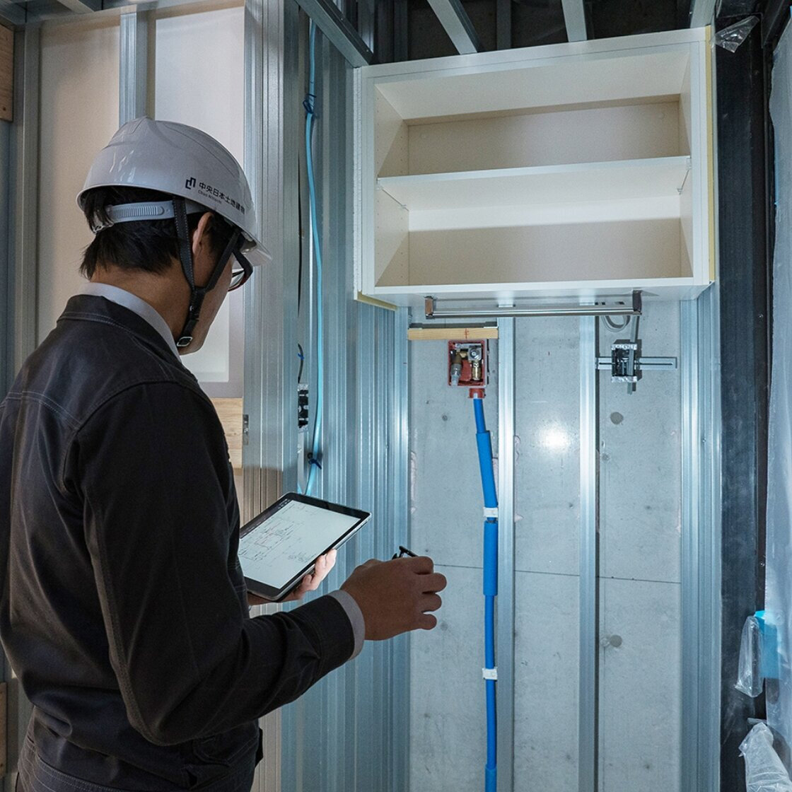 中央日本土地建物の品質管理部は、設計監理・施工管理・カスタマーサポートの3チームで構成されており、私は建設現場での施工品質管理を担当しています。お客様が末長く安心してお過ごしいただける住まいであるために、漏れのない徹底した品質管理を心がけています。