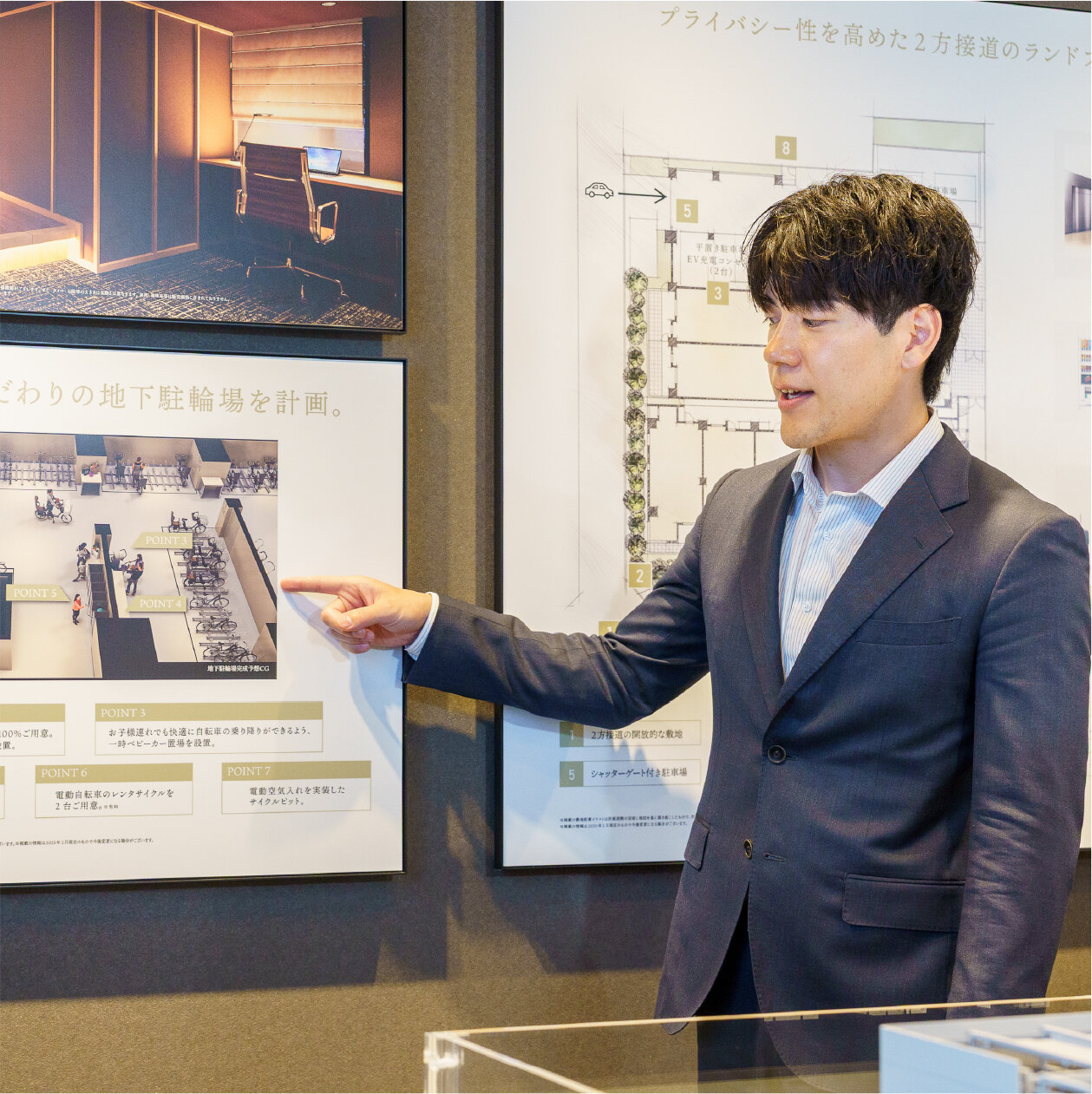 商品企画にあたっては、「そのエリアのニーズに最も適した仕様を採用する」というブランド方針のもと、まず近隣マンションに住む方々に対して意識調査を行います(※一部物件を除く)。その結果をもとに社内で打ち合わせを重ね、どのようなマンションにするのか、コンセプトや仕様の方向性を定めていきます。 自分たちの思い込みではなく、そのエリアの方々が本当に求める住まいを実現するための、重要な工程です。私が担当した「バウス日暮里」においても、周辺の複数の既存マンションにお住まいの方々を対象に、暮らしに関するアンケート調査を実施し、このエリアで多い共働き・子育て世帯のニーズを洗い出して、商品企画に反映しました。また、他社の事例なども研究しながら、このエリアに本当に必要なもの、足りていないものは何かを追求し、"生活に必要な機能を確実に満たす"という想いで、社員が知恵を出し合って商品企画に取り組んでいます。