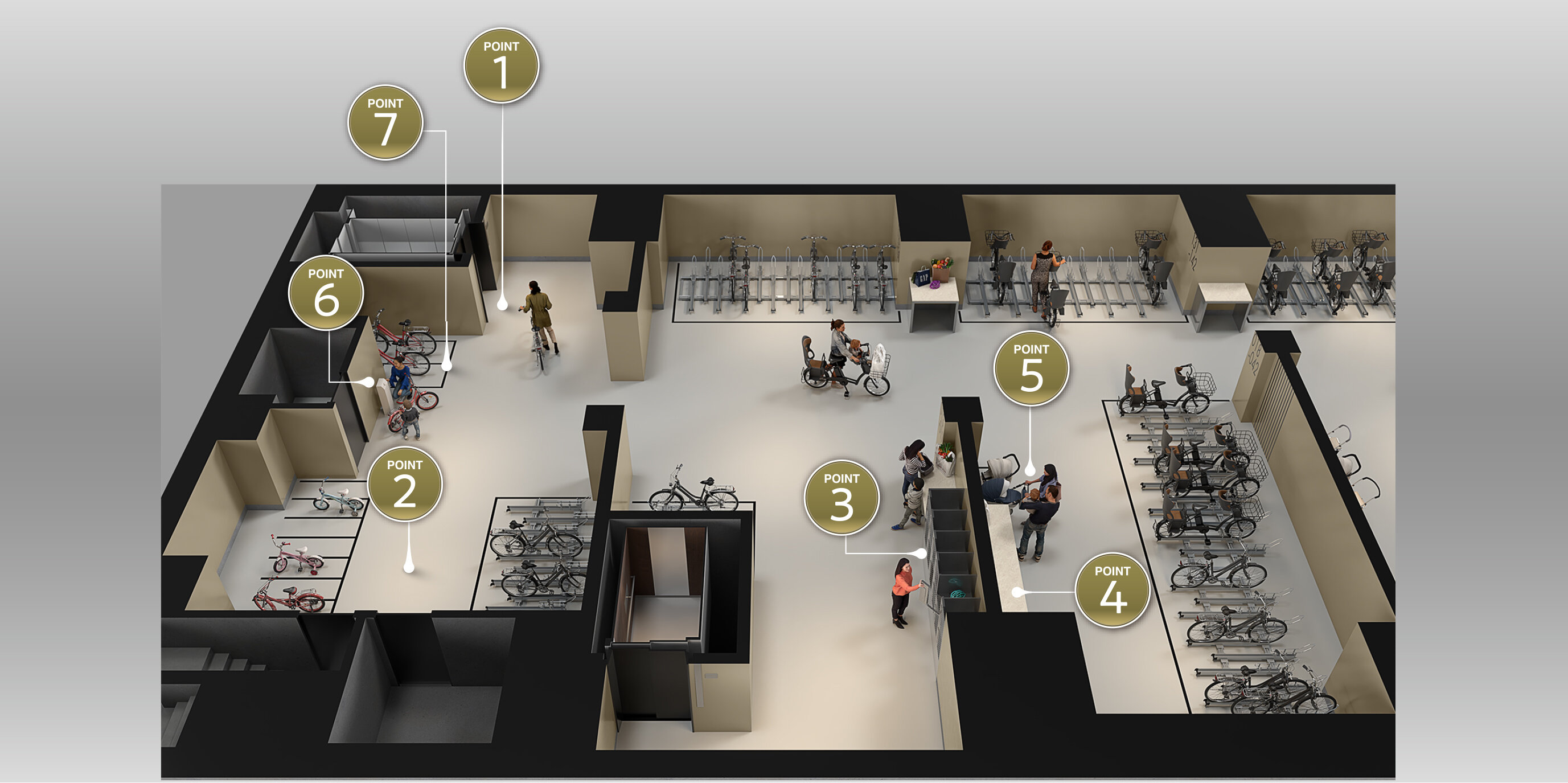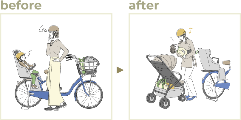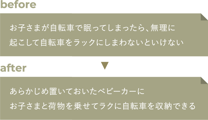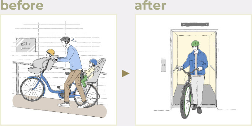 自転車でのお出かけが多い子育て世帯の暮らしに配慮し、地下駐輪場内には住む方のベビーカーを一時的に置いておけるスペースを確保。公園遊びや買い物から帰る途中で、お子さまが自転車で眠ってしまっていても、そのままベビーカーへ乗せ替えることができ、買い物袋などの荷物もベビーカーに移し替えて自転車をラックに収納できます。