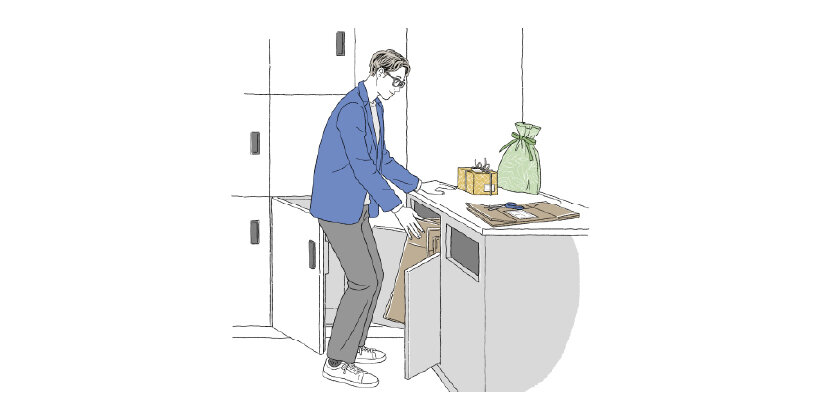 メールコーナーには、届いた宅配物をその場で開梱できる荷捌きスペースを設置。宅配ボックスから宅配物を取り出し、梱包用の段ボール箱や紙袋などはその場で処分できるため、必要な商品だけを自宅に持ち帰ることができます。かさばる段ボール箱を抱えて運び、また1階のゴミ置き場に持っていく...という手間が省けます。