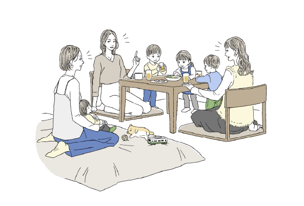 リラックスしてゆったりとくつろげる小上がりスペースでは、気の合う子育て家族が親子でお茶会を開いたり、お誕生日会を催したりと、気軽に愉しめます。