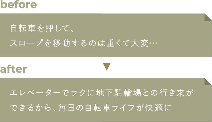 雨や風の影響を受けにくい地下駐輪場を全戸分ご用意。1階とつながる専用の直通エレベーターを設置しているため、自転車を押して長いスロープを移動する必要がありません。重たい自転車でもスムーズに出し入れでき、日々の負担を軽減します。