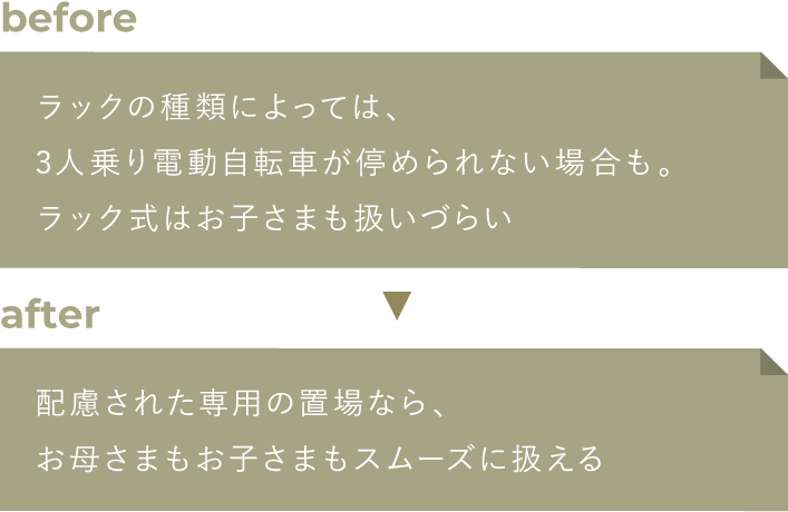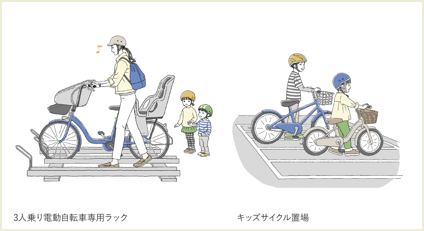 チャイルドシートがある部分は横幅があり、重量もある3人乗り電動自転車は、一般的な駐輪場では停められない場合も。そんな幅のある3人乗り電動自転車に考慮した駐輪ラックを各戸分採用。また、お子さまが自分の自転車を簡単に停められるよう、平面式のキッズサイクル置場も設けています。