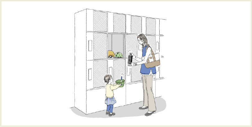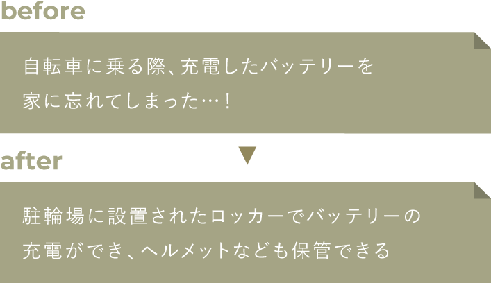 電動自転車のバッテリーは、従来だと住戸内へ持ち帰って充電するため、「朝の急いでいるときに限って、充電したのに持ち出し忘れてしまった。」「お子さまをつれて取りに戻るのは大変。」ということも起こりがちです。そのため、バッテリーの保管と充電が同時に完結できるよう、共用部にコンセント付きロッカーを設置。ロッカーにはヘルメットなどの自転車関連グッズも保管できて便利です。