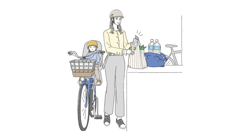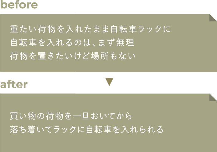 買い物帰りの駐輪場では、荷物に加えてお子さまも降ろさなくてはならず、一度にいくつもの動作が重なります。地下駐輪場内の各所には一時的に荷物を置けるスペースを設けているため、荷物を床に置かずに済み、自転車単体で駐輪できます。