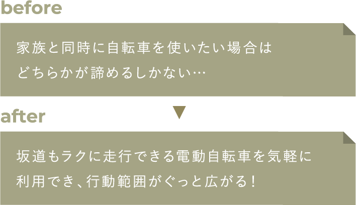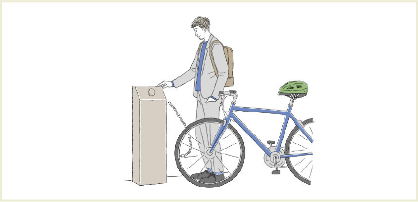 自転車ライフの利便性をさらに高めるため、地下駐輪場内に電動自転車のレンタサイクルを2台ご用意。急な坂道のある場所へ行く場合や重い荷物を運ぶ場合に便利なほか、家族で自転車の利用が重なった時にも役立ちます。予約はスマートフォンで簡単にでき、利用料金もキャッシュレス決済です。