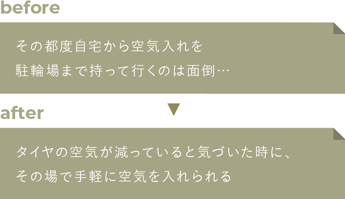 日常的に使用する自転車にいつでも快適に乗ることができるよう、電動空気入れを備えたサイクルピットを地下駐輪場内に設置。自宅から空気入れを持ち出す必要がなく、思い立ったときにその場でタイヤの空気圧を整えることができます。いつも空気圧を適正にしておけば、走行が軽くなるだけでなく、パンクや転倒のリスク軽減にもつながります。