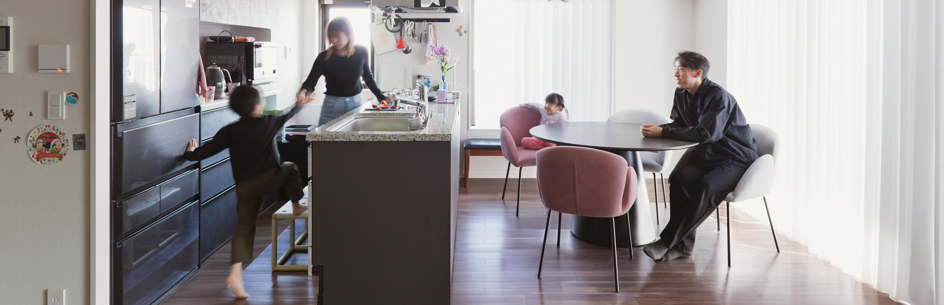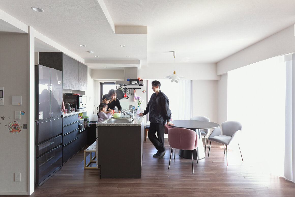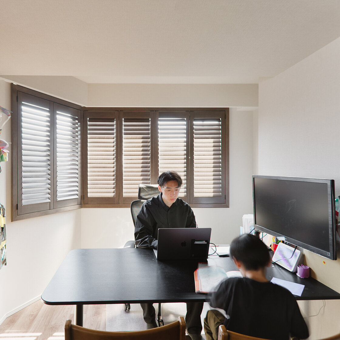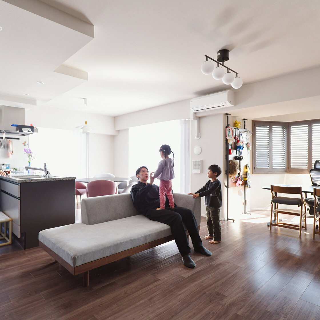 K様ファミリーの以前のお住まいは、夫Kさんの会社が都内渋谷区に所有する2LDK+S・86㎡のマンションでした。妻Hさんの勤務先である中目黒にもほど近く、広さ的にも余裕はあるものの、「寝室は広いのに、何しろリビングが狭くて…」。自宅でのお仕事がメインの夫Kさんにとって、家は生活の場であると同時に、オフィスでもあります。2人のお子さんが在宅する時間は、仕事と家事育児を両立させなくてはなりません。「リビングを仕事場と遊び場として兼用していたため、もっとゆとりのあるリビングがいいねということになったんです」。