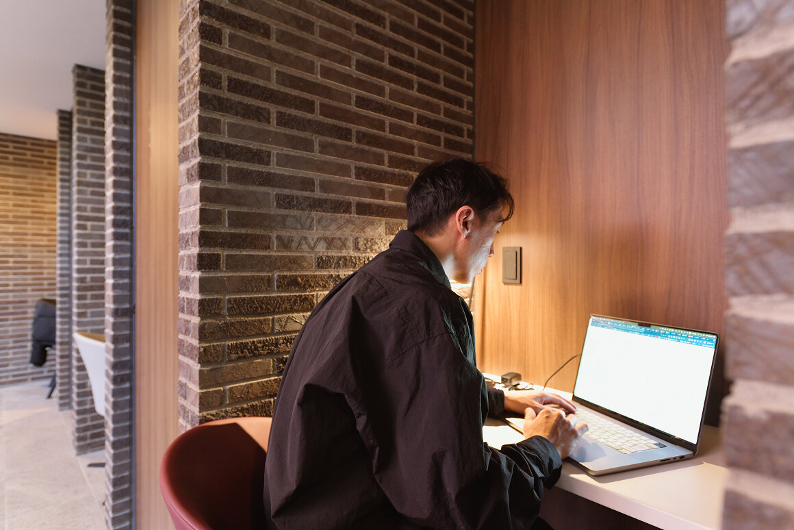 バウス鷺沼Hillsの共有部には、2層吹き抜けのラウンジが設けられています。広々とした空間の一角には、予約制の個室テレワークブースや自由に使えるワークカウンター、カラー複合機などが配置され、K様ファミリーも頻繁に利用されているといいます。「2人の在宅勤務が重なったときや、夜間に集中して作業に取り組みたいときにも便利なんです」。